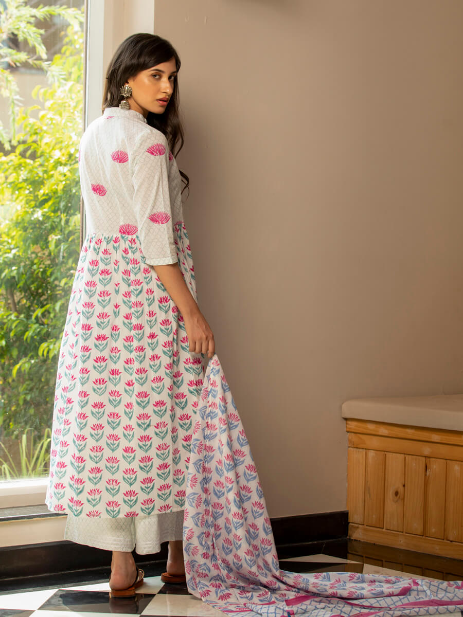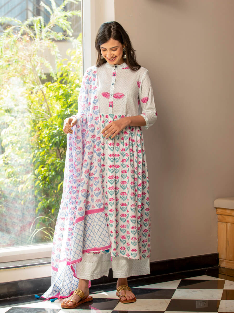 Padma or the Lotus is a central figure in many art forms including Pichhwai. It's a flower with meaning, beauty, and great cultural significance. The origin of the Lotus in Hindu mythology goes as far back as 'Samudra Manthan'. Its first association is with Lakshmi who also emerges from 'Samudra', hence, is referred to as Padmaja or Padmavati. This hand block printed womenswear collection is inspired by the beautiful lotus and other nature inspired elements. Handcrafted in fine cotton and modal silk, Padmaja is perfect for intimate festive occasions.