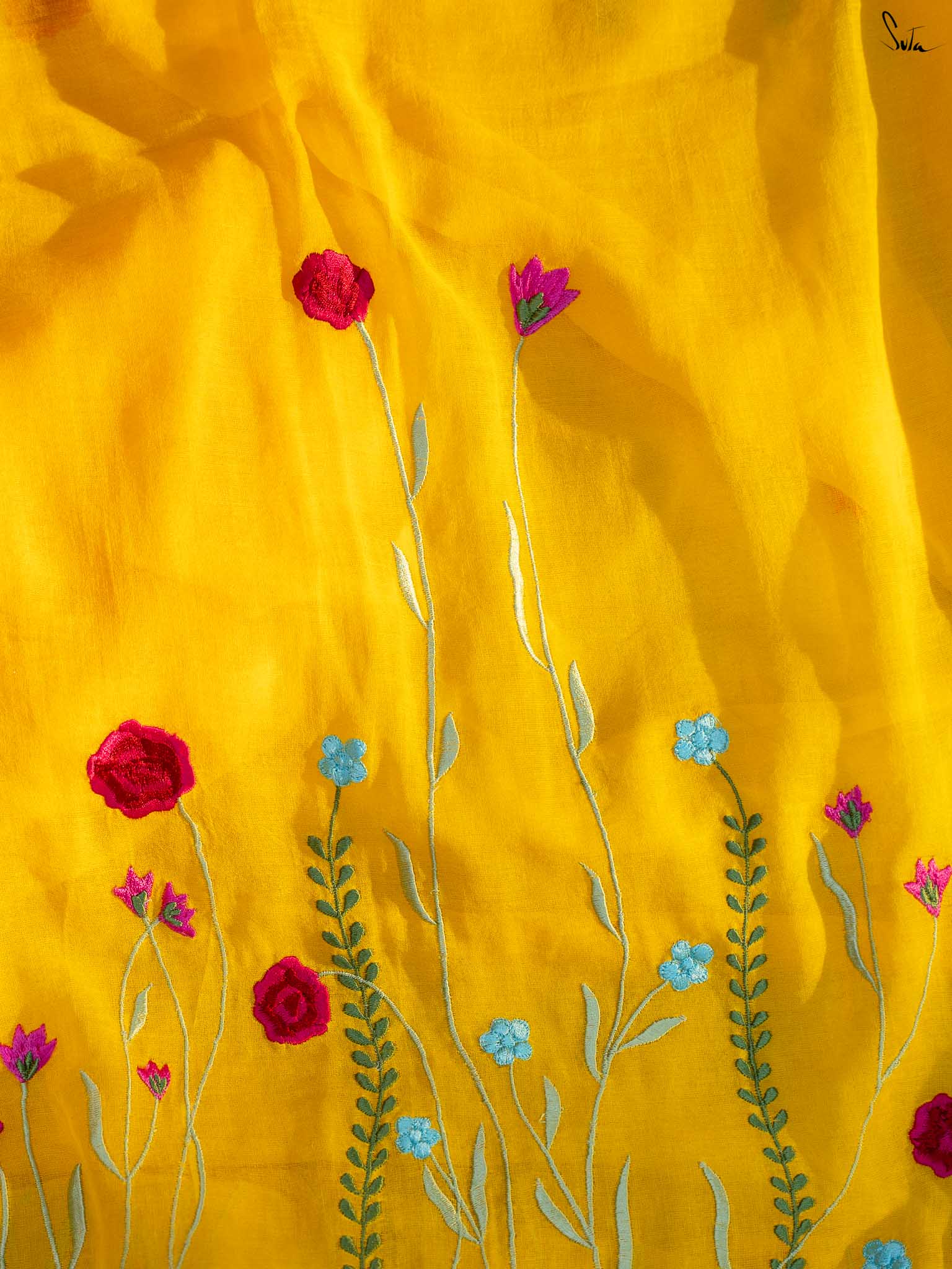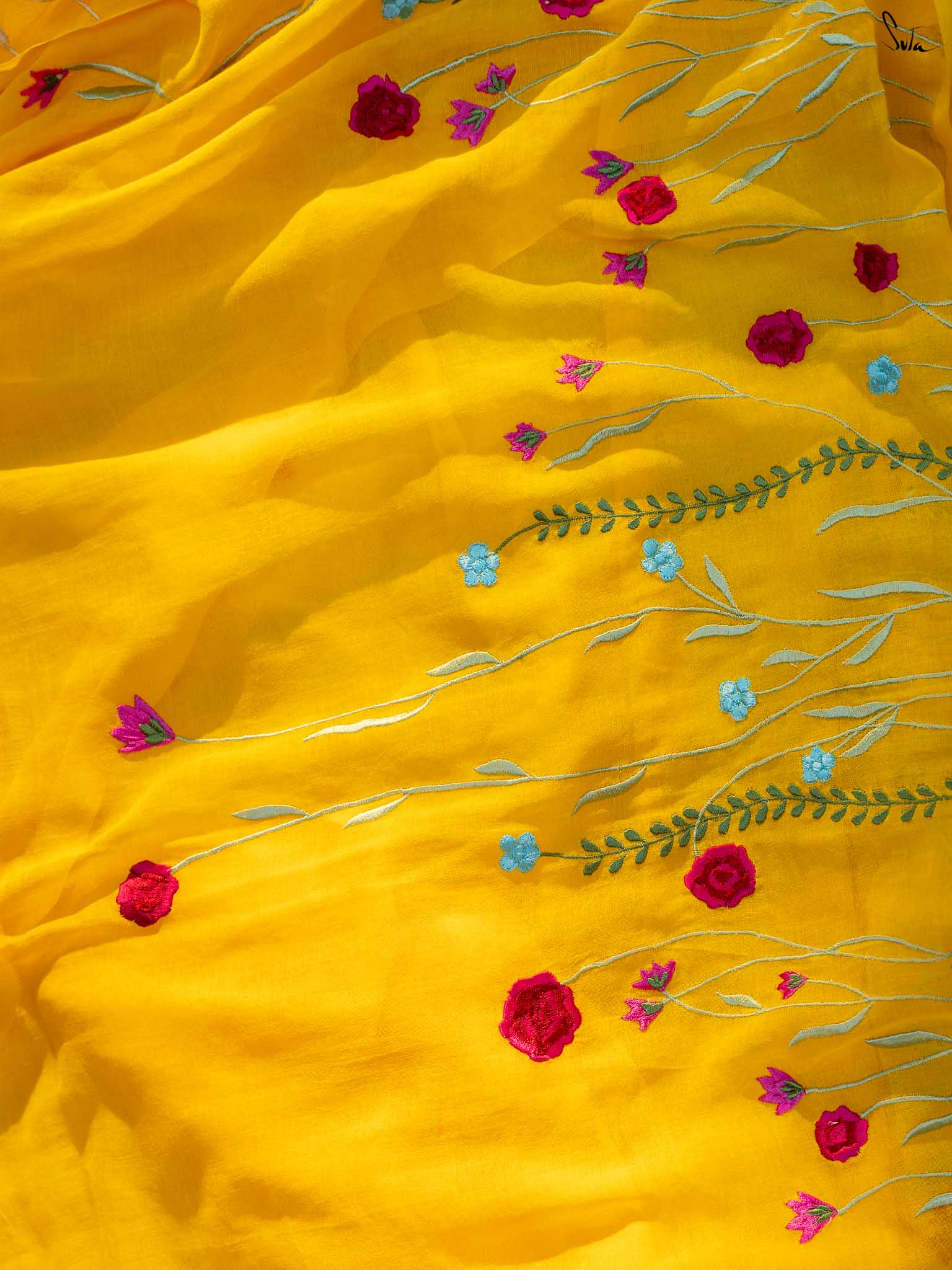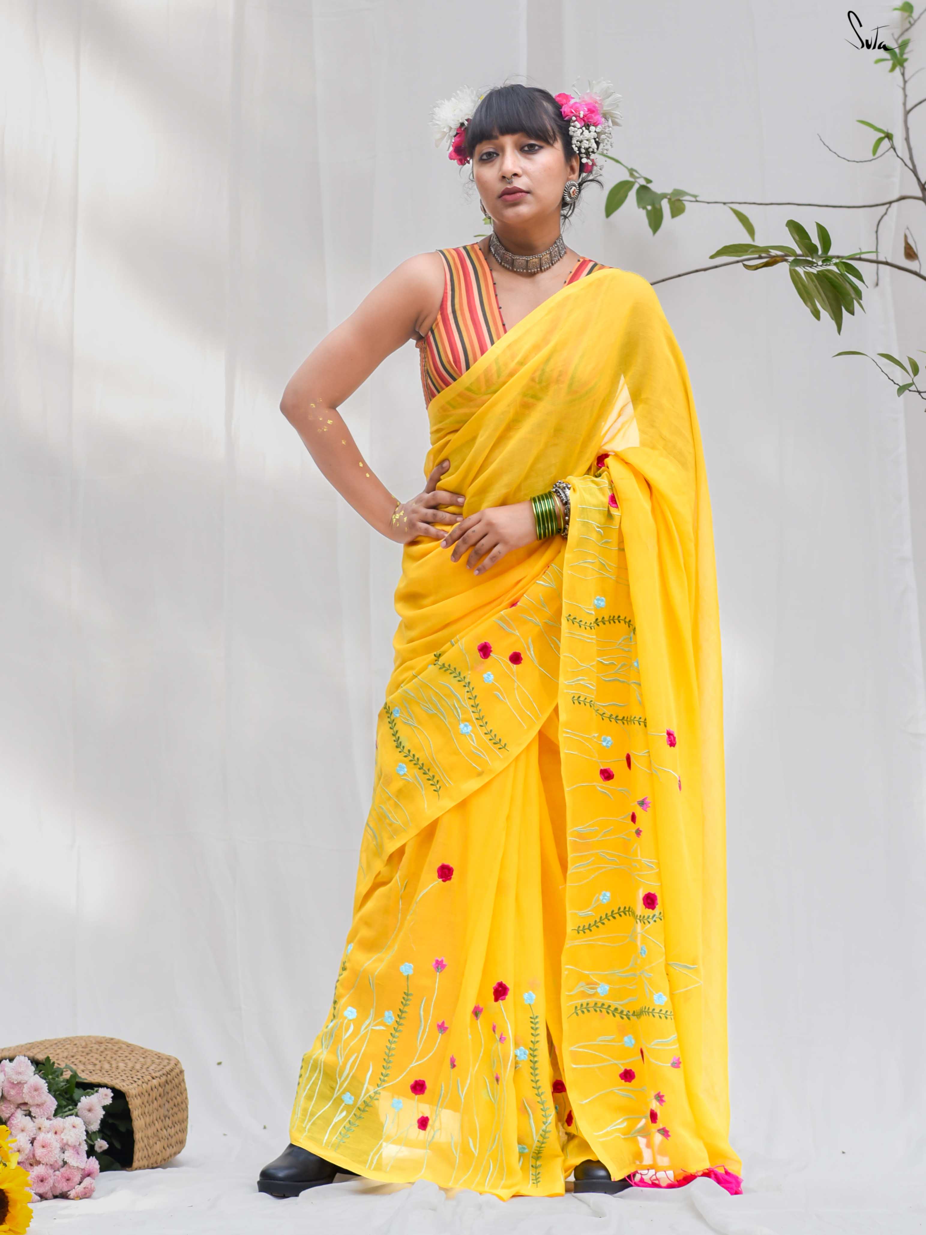Soft, sunny, and full of gentle warmth, this saree captures the heart of Basant in its delicate embroidered florals. The mul cotton drape is feather-light and breathable, while the pink crochet lace adds a sweet pop of contrast, like spring flowers blooming against golden light.