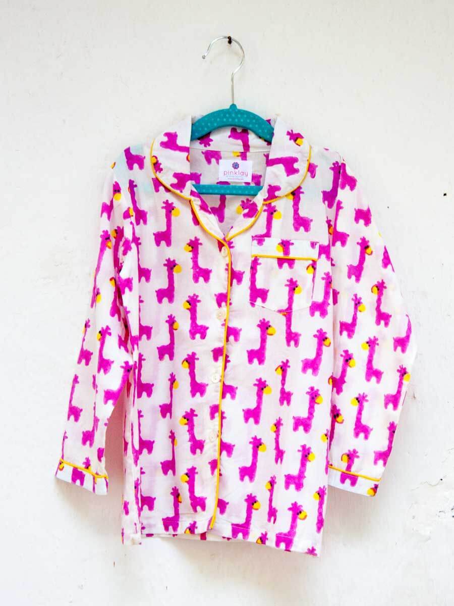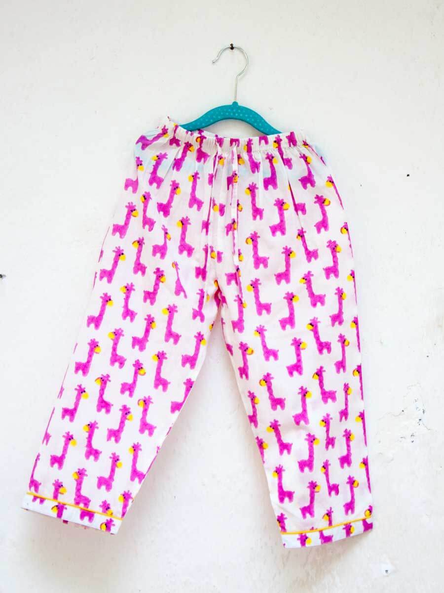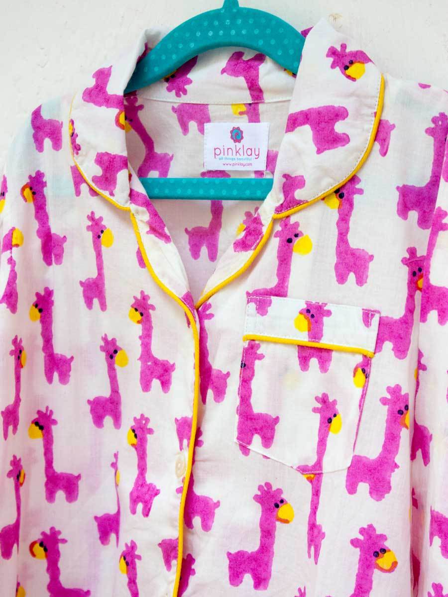 Pink Giraffe Block Printed Cotton Top & Pyjama Set