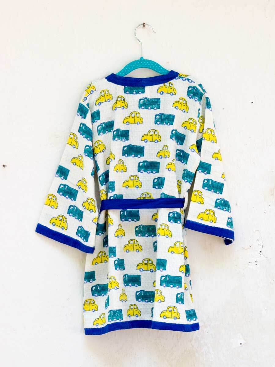 Bathing has never been more fun! Crafted in premium waffle cotton, these hand block print bath robes make for a cute addition in your child's wardrobe. The bath robe comes with an adjustable belt inside for easy fastening.