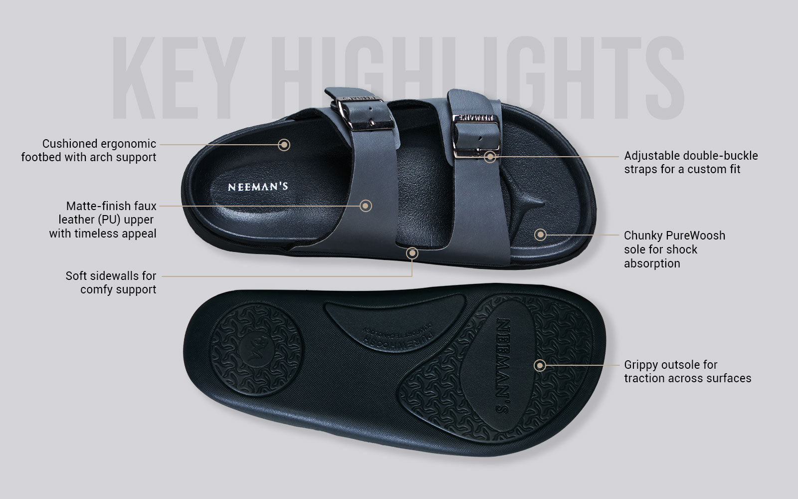 Say hello to a slide that gets it all right—style, support, and ease. PureWoosh Flow is Neeman’s spin on the timeless double-buckle silhouette, now reimagined for modern-day comfort seekers. With a sleek matte finish and soft contoured footbed, it’s built to slide into any outfit and any mood. Rain-ready, ridiculously comfy, and made to move with you, this one's a true multitasker. From weekday errands to weekend lounging, it brings just the right amount of polish to your off-duty days.