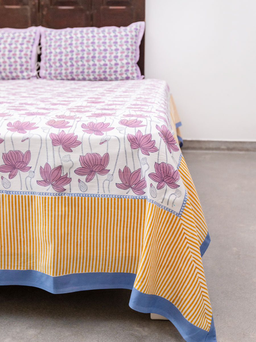 Purple Lotus Hand Block Printed Cotton Bed Sheet