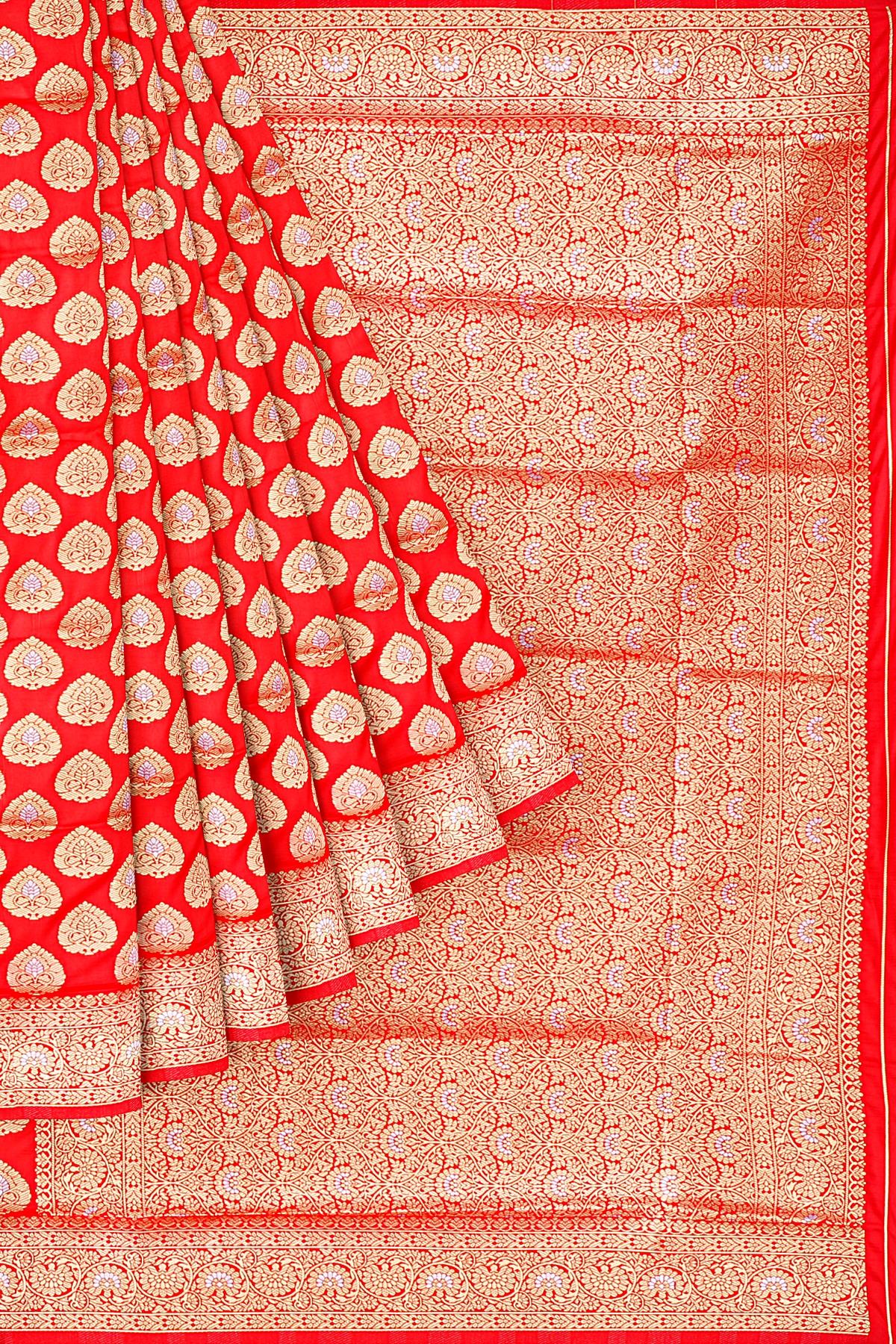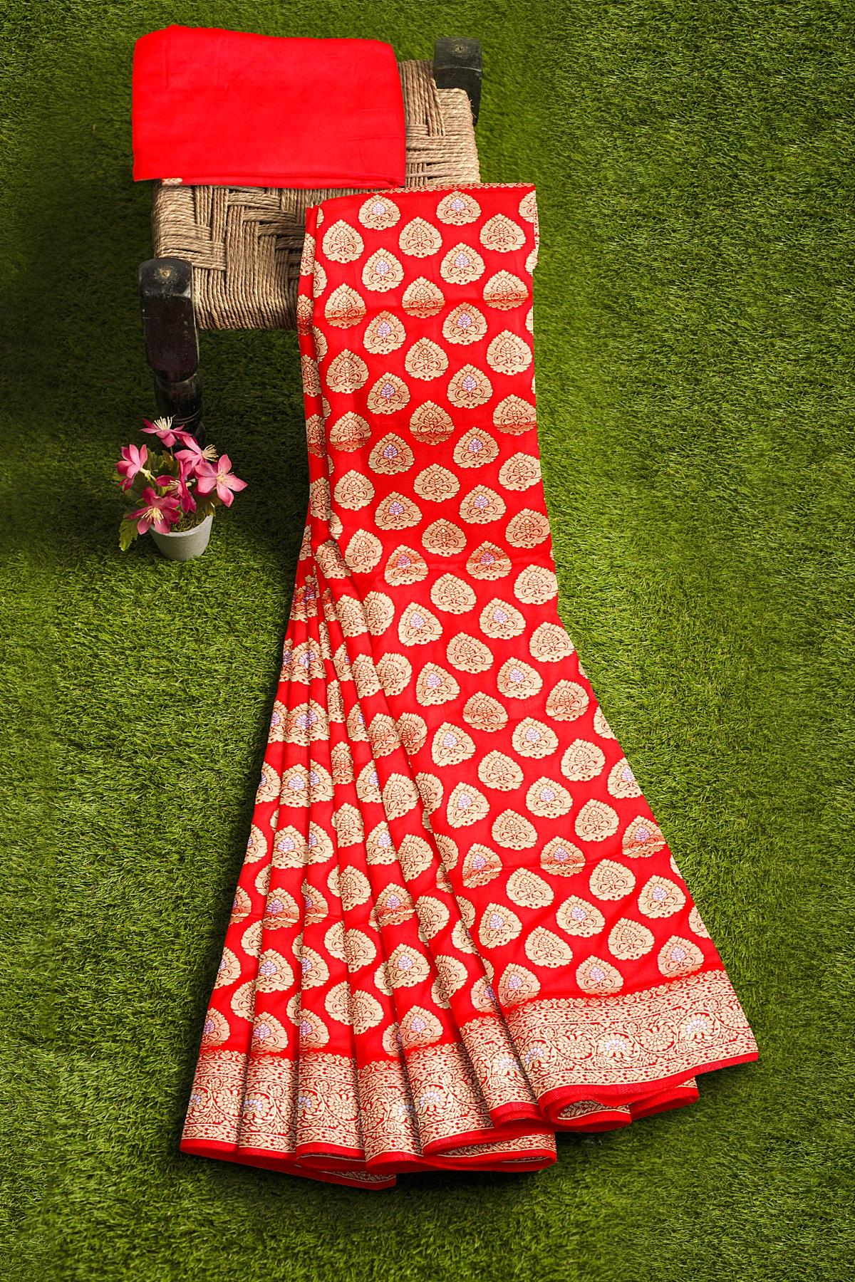 Latest RED BUTTIS SILK BLEND Saree with SELF ZARI border. This saree comes with PLAIN WITH BORDER SILK BLEND blouse.