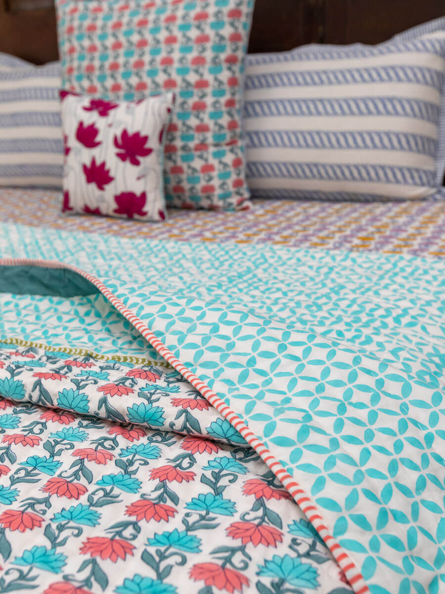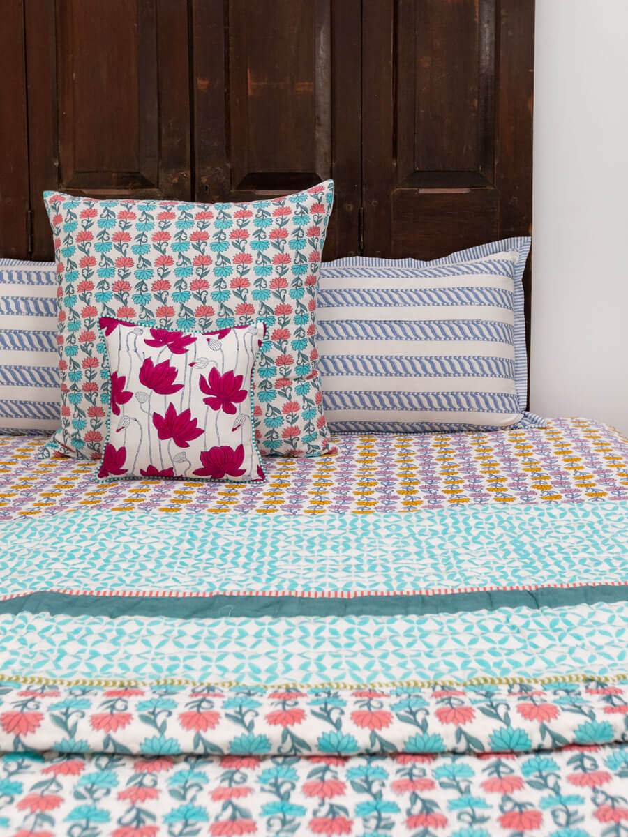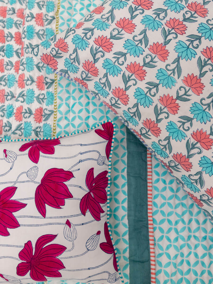 Padma or the Lotus is a central figure in many art forms including Pichhwai. It's a flower with meaning, beauty, and great cultural significance. The origin of the Lotus in Hindu mythology goes as far back as 'Samudra Manthan'. Its first association is with Lakshmi who also emerges from 'Samudra', hence, is referred to as Padmaja or Padmavati. This hand block printed home textiles collection is inspired by the beautiful lotus and other nature inspired elements.