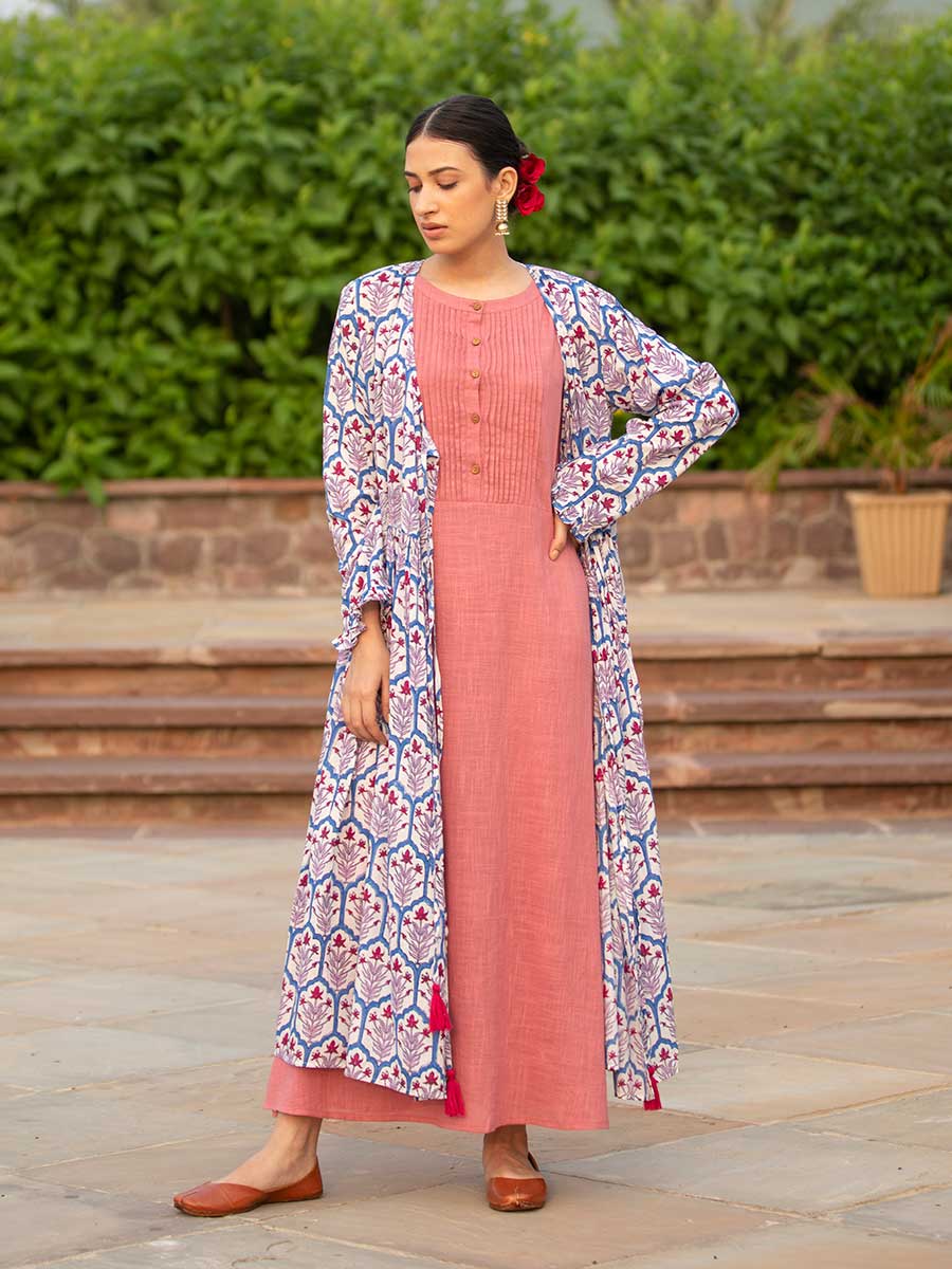 An A-line long cotton slub sleeveless pintuck dress – extremely versatile and can be styled in various ways or combined with our angrakha jackets to make a festive set.