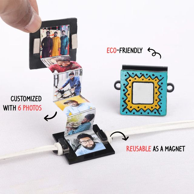 Meet our bestselling ‘Secret Photo Rakhi’ – crafted from eco-friendly terracotta, customized with 6 personalized photos, and designed to be reused as a fridge magnet.