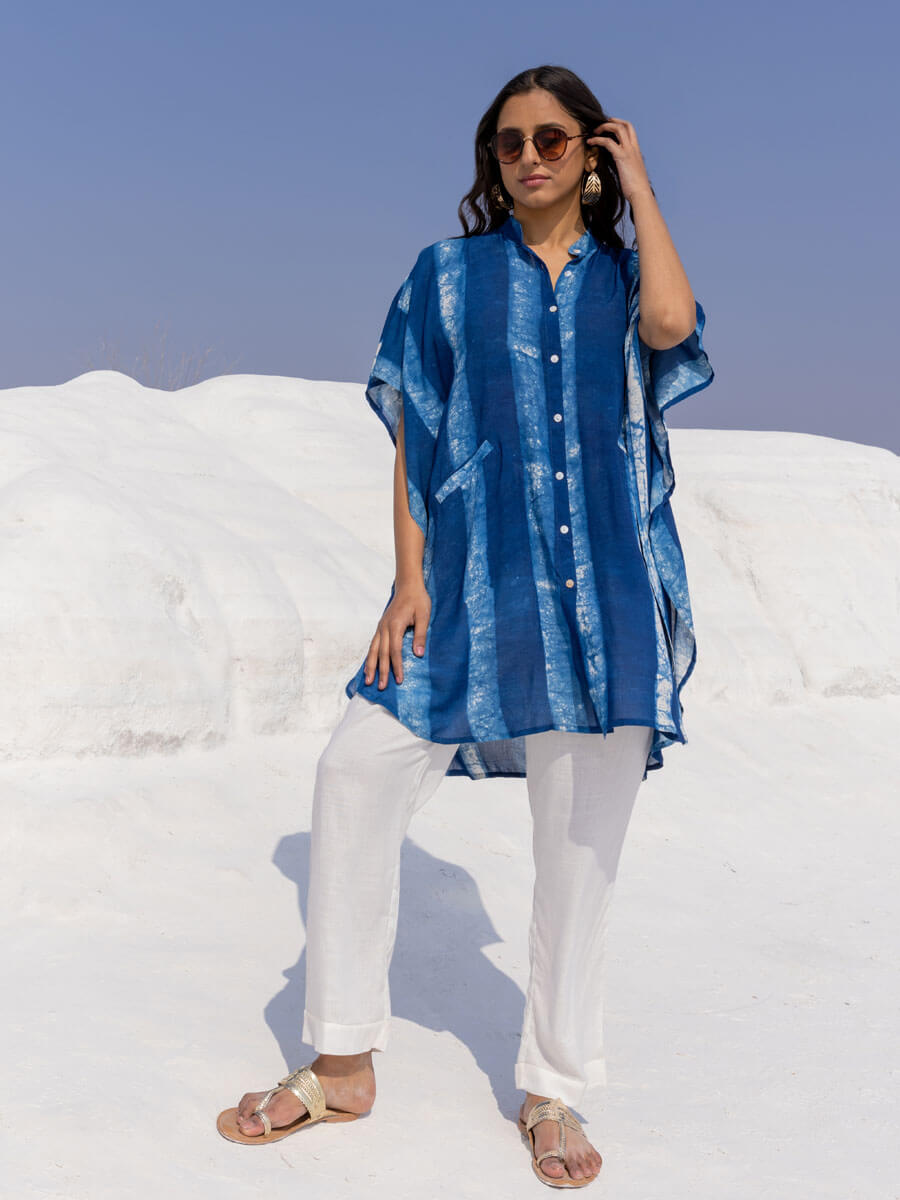 - Shirt dress: Dabu hand block printed in natural blend indigo