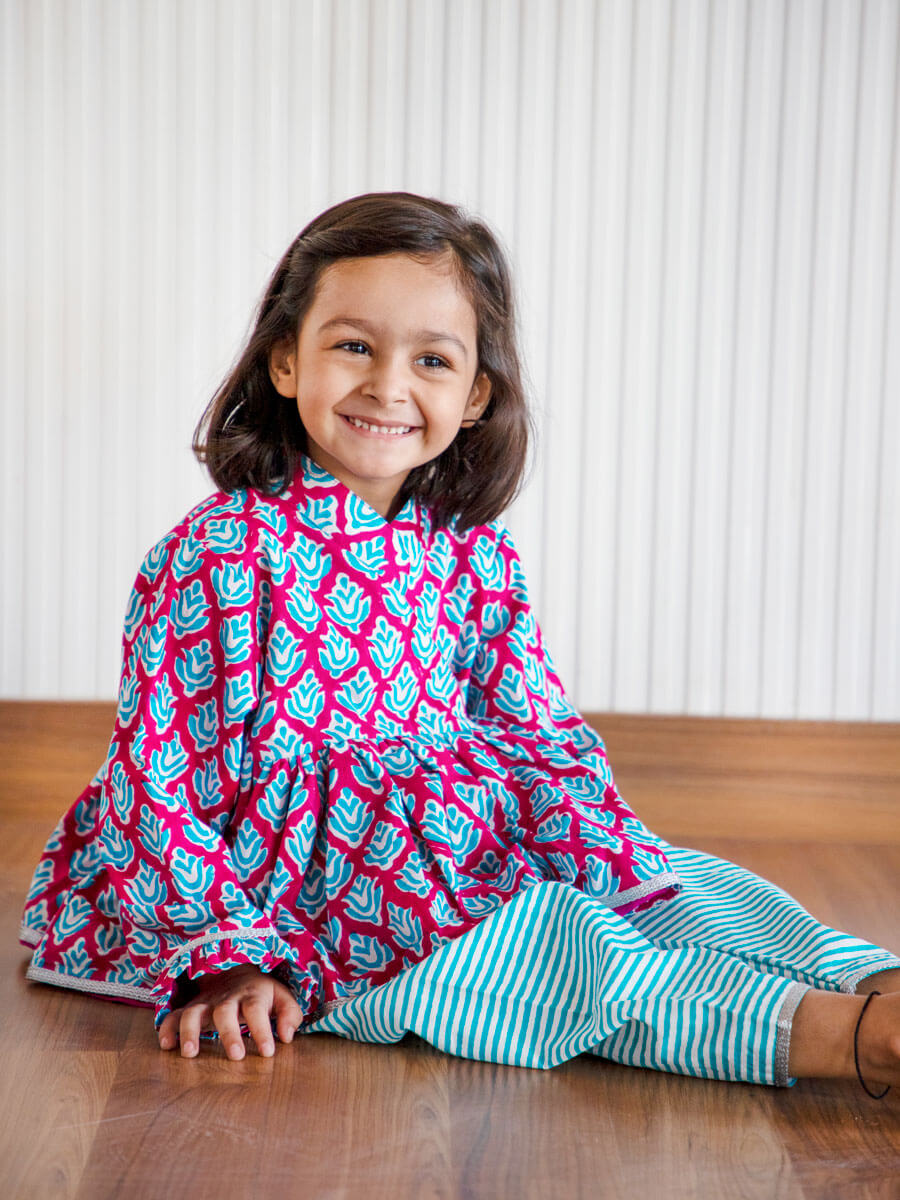 Presenting beautiful ensembles for our little customers. Keeping true to our style and quality commitment, each piece is handcrafted in certified organic cotton. Hand block printed with traditional butis, embellished with fine lace and designed to be super comfortable; our festive collection makes kids sparkle!