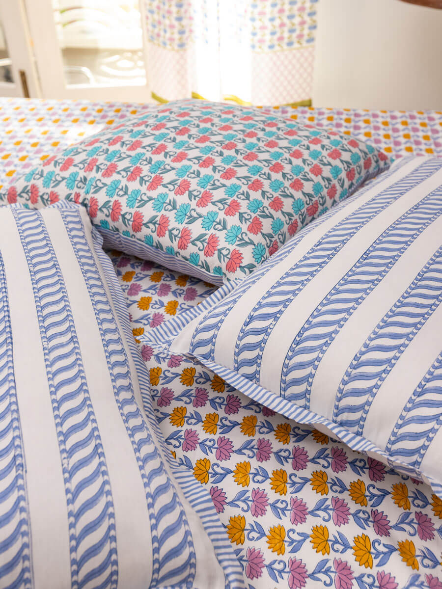Padma or the Lotus is a central figure in many art forms including Pichhwai. It's a flower with meaning, beauty, and great cultural significance. The origin of the Lotus in Hindu mythology goes as far back as 'Samudra Manthan'. Its first association is with Lakshmi who also emerges from 'Samudra', hence, is referred to as Padmaja or Padmavati. This hand block printed home textiles collection is inspired by the beautiful lotus and other nature inspired elements.
