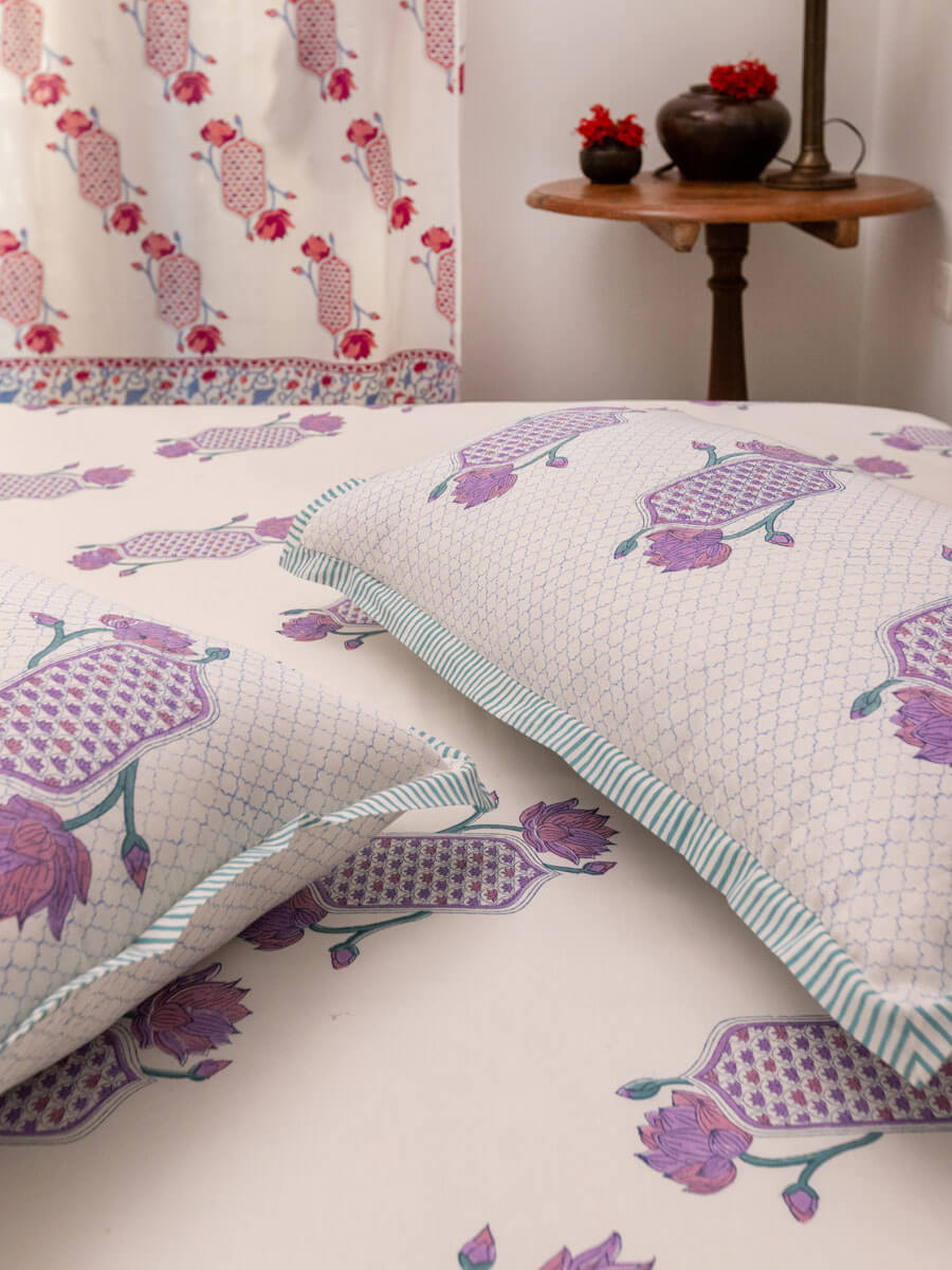 Padma or the Lotus is a central figure in many art forms including Pichhwai. It's a flower with meaning, beauty, and great cultural significance. The origin of the Lotus in Hindu mythology goes as far back as 'Samudra Manthan'. Its first association is with Lakshmi who also emerges from 'Samudra', hence, is referred to as Padmaja or Padmavati. This hand block printed home textiles collection is inspired by the beautiful lotus and other nature inspired elements.