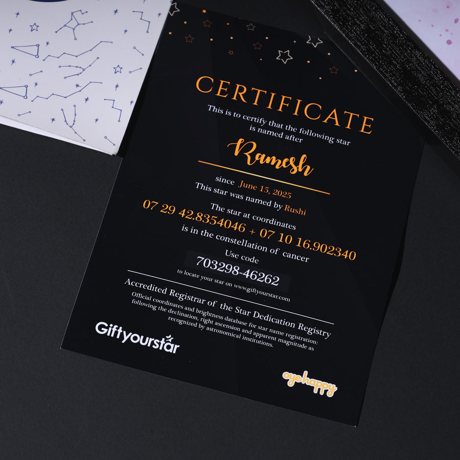 Please note that Oye Happy is a facilitator for the naming service, GiftYourStar, which is an Accredited Registrar of the Star Dedication Archives.