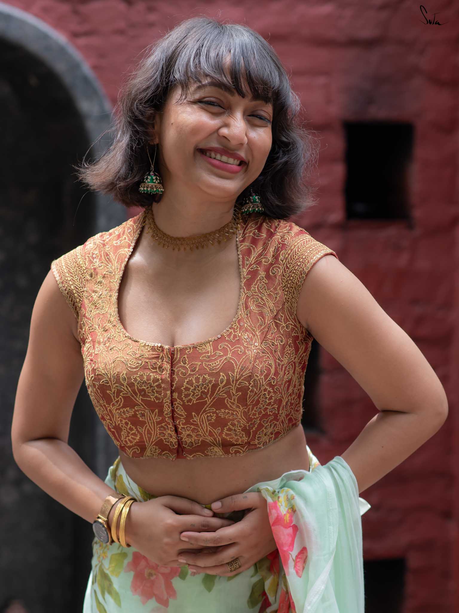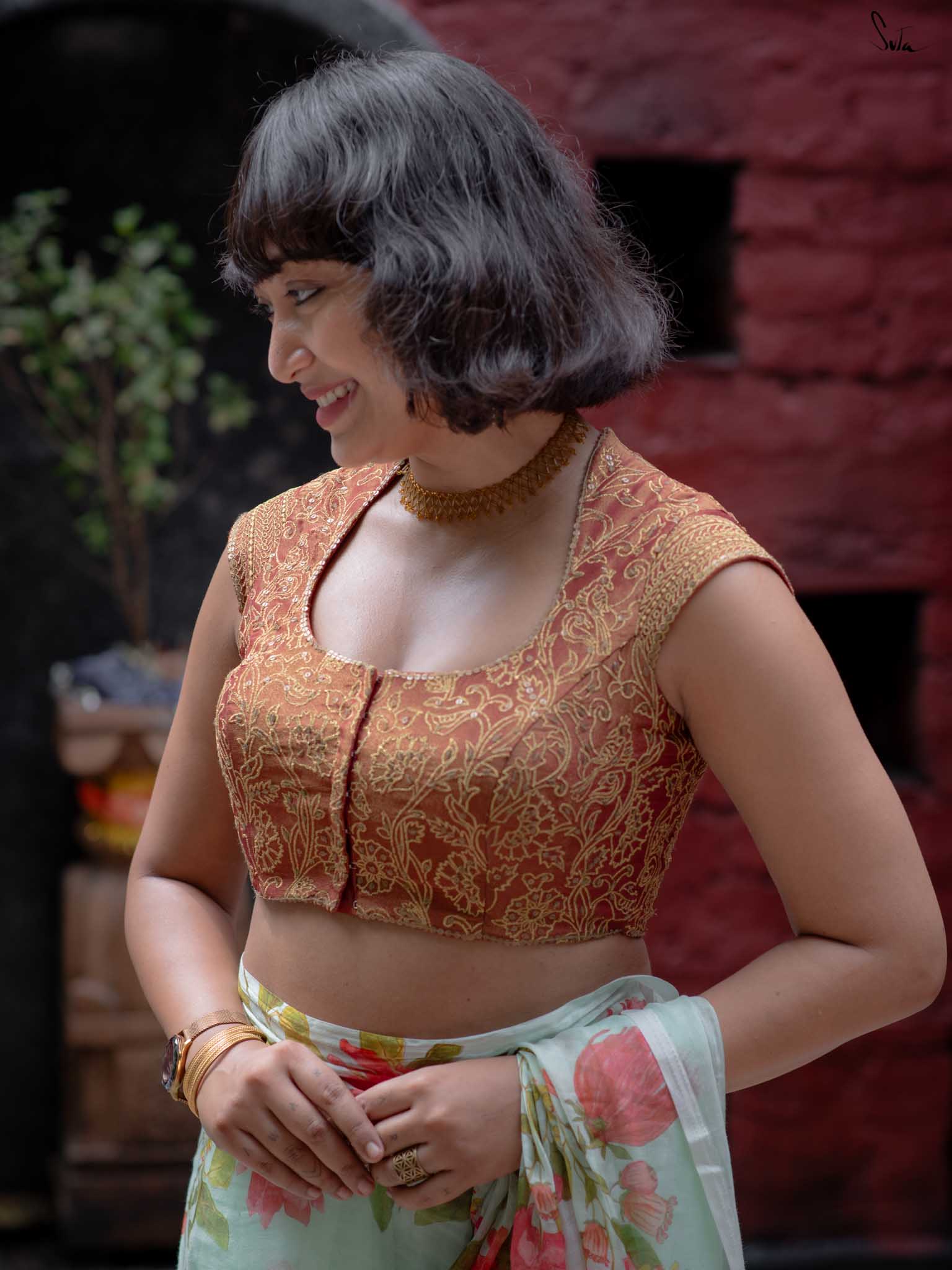 The model is wearing size S blouse and the saree is Mangal