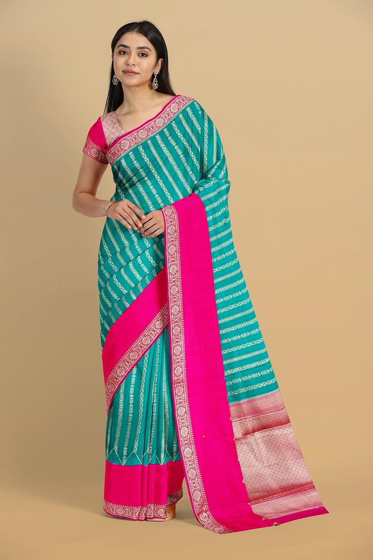 Latest TEAL JAAL GEORGETTE Saree with CONTRAST ZARI border. This saree comes with CONTRAST WITH BORDER GEORGETTE blouse.
