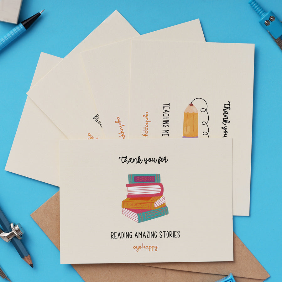 A teacher's day gift that is cute, colorful, and packed with kindness! This set of 5 adorable thank you cards is perfect for students or anyone looking to thank a teacher in the most adorable way. It's thoughtful, fun, and sure to make them feel extra special.