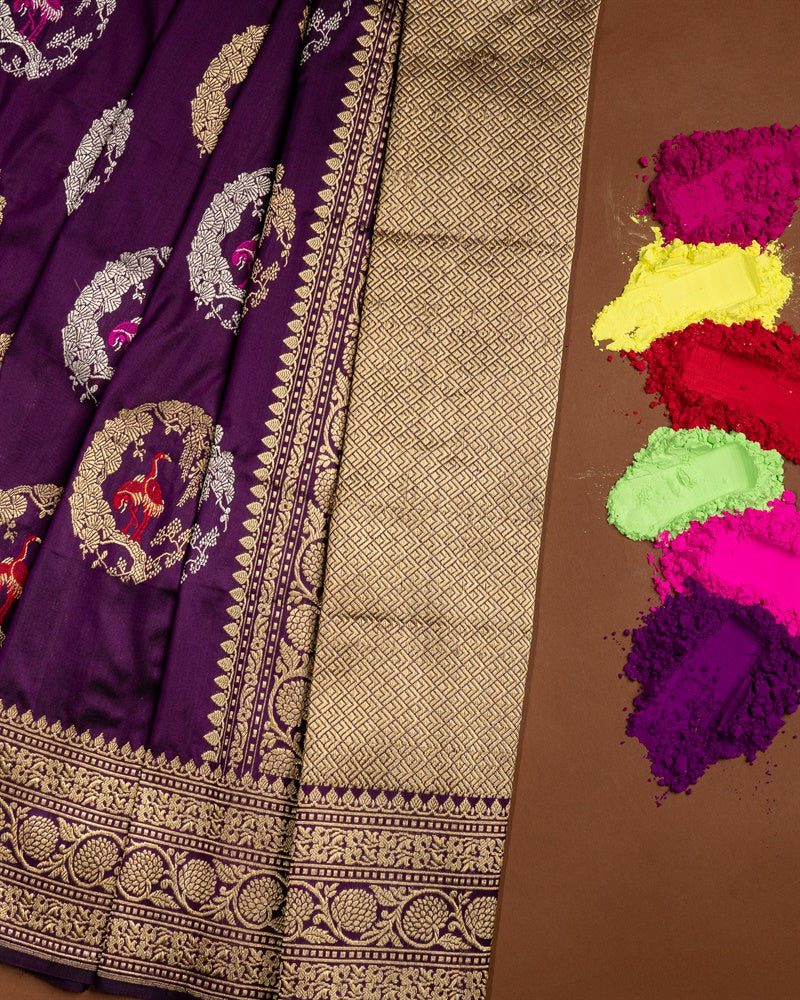Have a peek at this painstakingly curated Banarasi Silk Purple Saree, which is destined for greatness. The lustrous texture of the saree is artistically adorned with Birds in Floral Circles, and it has a Self Zari Florals and Leaves border composed of rich weaving and exquisite design that lends an overpowering elegance to the saree. This airy saree is boosted with an astounding Diamond Brocade pallu and a Self With Border design blouse.