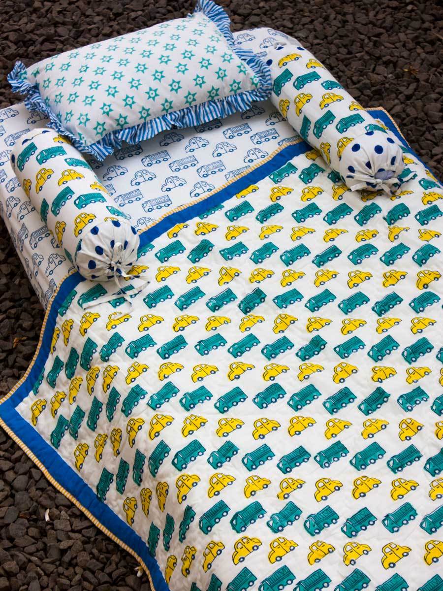 Dress up your baby's crib/cot with our lovely hand block print bolsters made with 100% GOTS certified organic cotton. The bolster cover can be easily removed for washing. This set contains two bolster pieces.