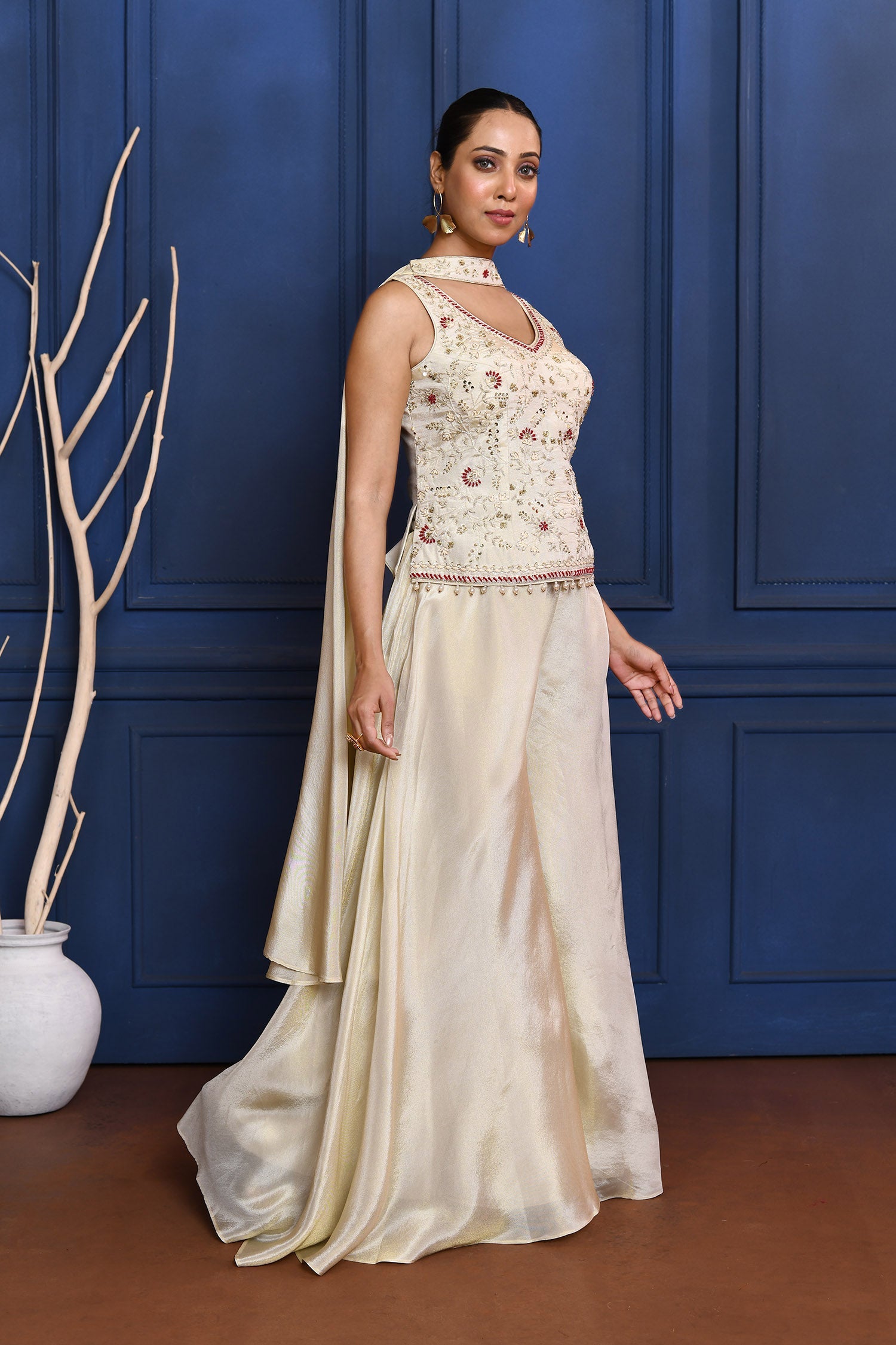 The white floral tissue indo-western set with embroidered top along with shiny palazzo and dupatta for an amazing stylish look with an ethnic touch.