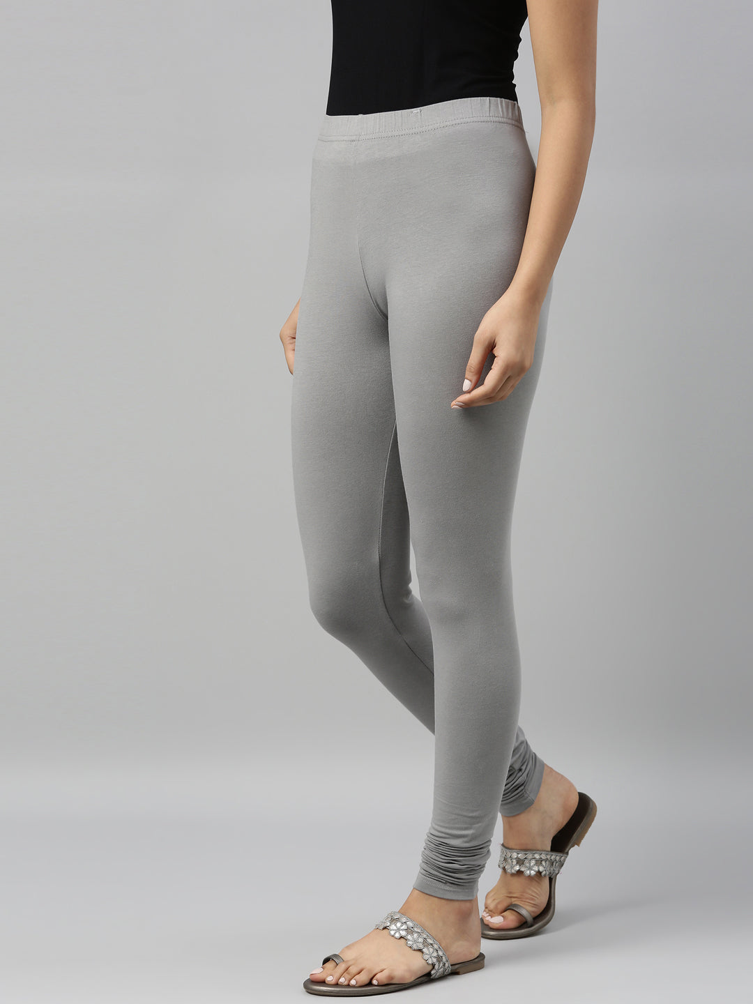 Go chic with a pair of Ebony Grey Solid Churidar Leggings. Made from high quality cotton, it has a elasticised waistband & gathers at the hemline.