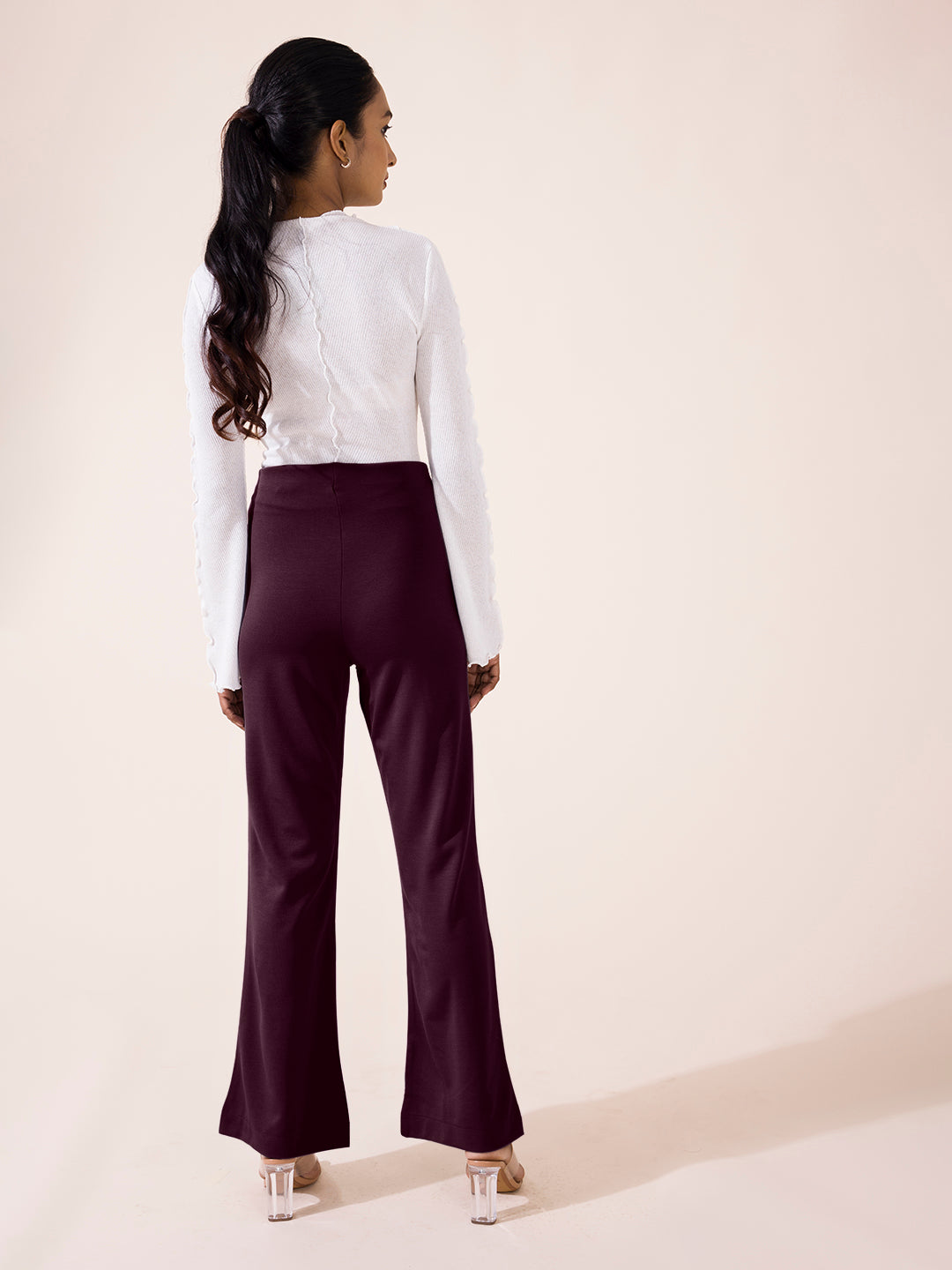 The Solid Dark Wine Ponte Bell Bottoms of flared pants bring a vintage-inspired charm to any outfit in no time. Made from Ponte, It has a elasticated waistband with high rise waist and flare fit.