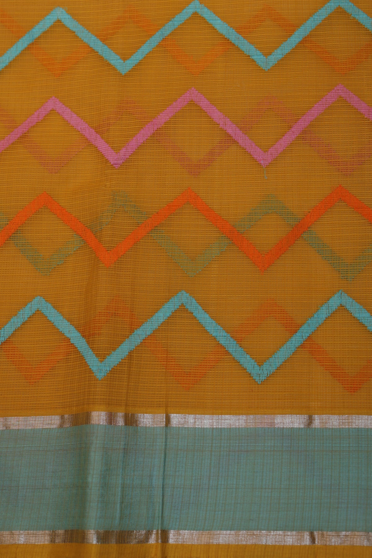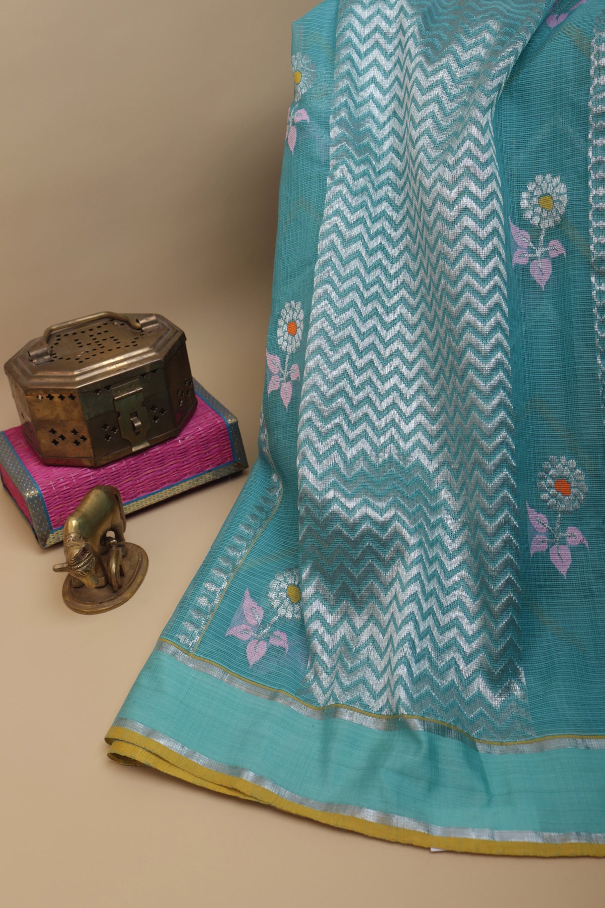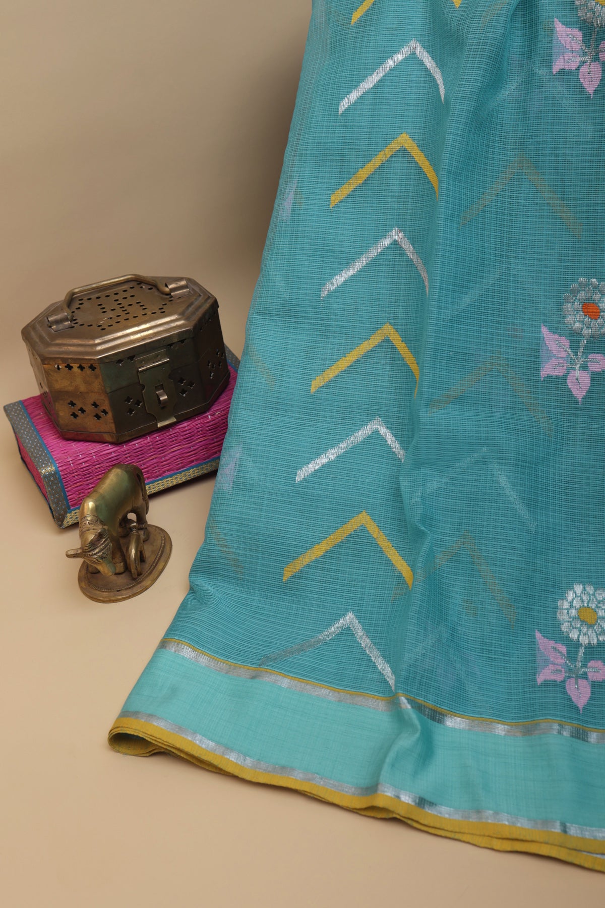 Step into the divine elegance of tradition with our Zari Kota Cotton Light Blue Saree. Adorned with delicate floral buttis and strips, it exudes a tantalizing aura. The lines edge contrast border adds opulent grace, while the brocade pallu envelops you in elegance. Paired with a blouse in contrasting hues featuring border detailing, this ensemble epitomizes classic beauty, perfect for festivals and weddings. Embrace the richness of tradition with every graceful drape.